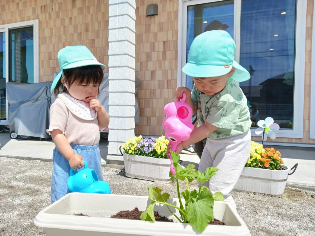 “おおきくなぁれ”と言いながら、お水をかける子どもたちです。