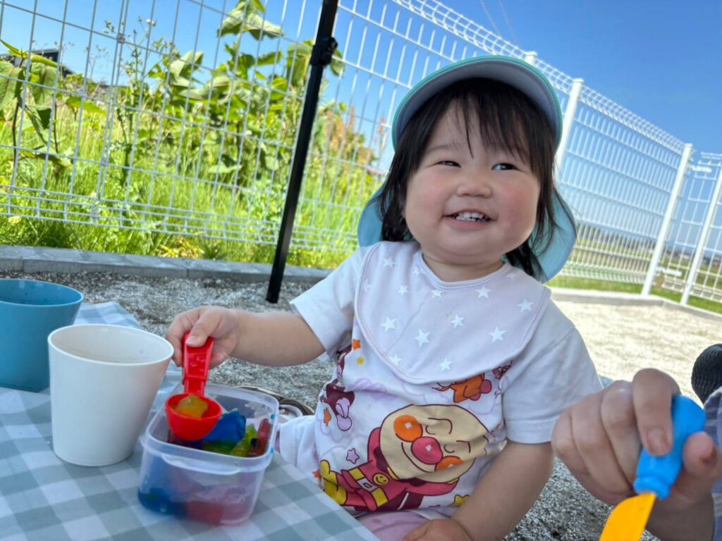 寒天遊びに夢中!感触がたまらなく素敵な表情です。